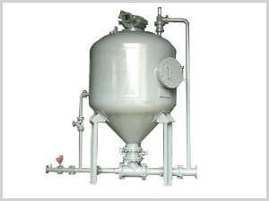 YJC系列倉泵的工作原理,同樣是運用流態化技術和氣力壓差原理來達到物料輸送目的,當物料進入泵體料滿后,關閉進料門,經過氣化使物料形成流態化后,順利進入收容室,同時射流噴嘴高速噴出氣流,帶著物料經過文氏管再次使氣物均化,進入輸送管道,即達到粉體物料的輸送目的,料氣分離,氣體經布袋除塵器過濾后排入大氣。